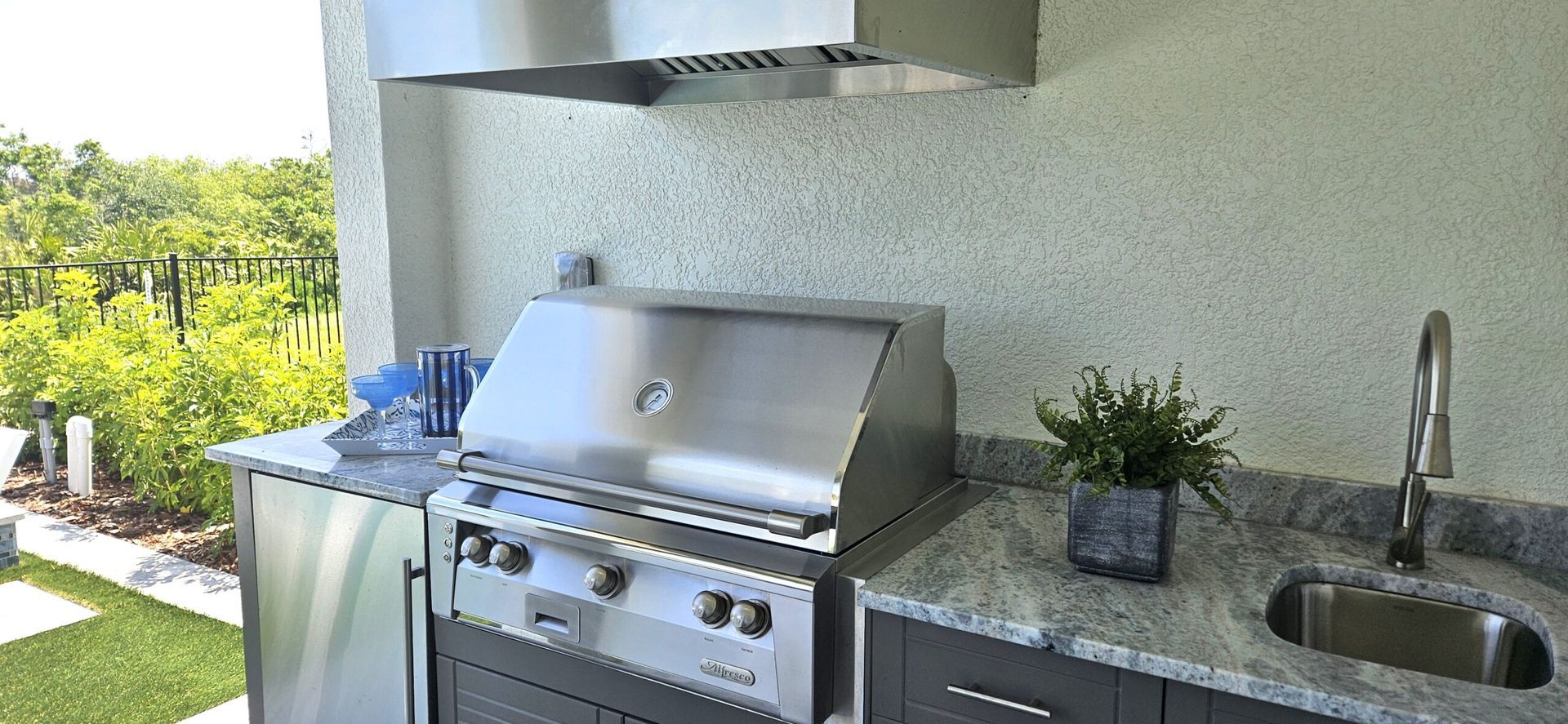 What turns a pool, some outdoor furniture, and a nice backyard into a memory-making entertaining space? A stylish poolside outdoor kitchen! Even with seemingly limited space, we teamed a Slate-colored cabinetry with Soho White countertops, and used them to frame a feature-rich Alfresco grill, vent hood, fridge, and sink. This kitchen becomes a stylish toolset for making meals and making memories!