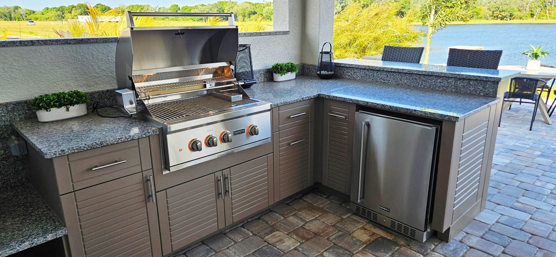We’re proud to have provided this L-shaped outdoor kitchen for our partners, David Weekley Homes. Featuring top-of-the-line grill and fridge from Coyote, this open-air build leads directly to an entertaining space under a beautiful Florida sky.