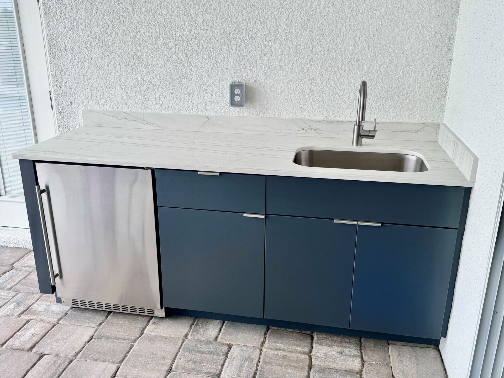 A subtle look for the stylish host, this minimalist outdoor bar features Moderno cabinetry in charcoal with sleek finger pull handles.