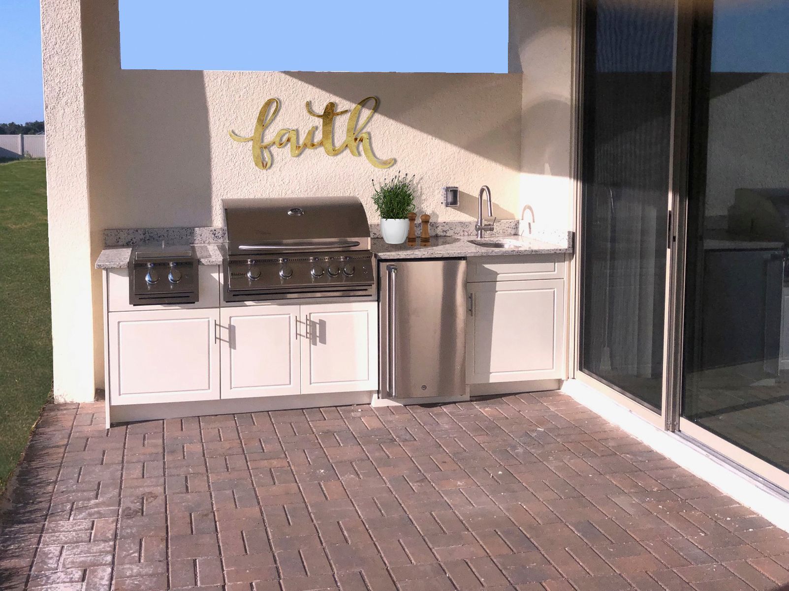 This bright outdoor kitchen contains all of the elements needed for a perfect outdoor cooking experience. This kitchen includes a Summerset Sizzler Pro and Side Burner duo, a beverage refrigerator for keeping drinks cold, and a sink for keeping hands clean.