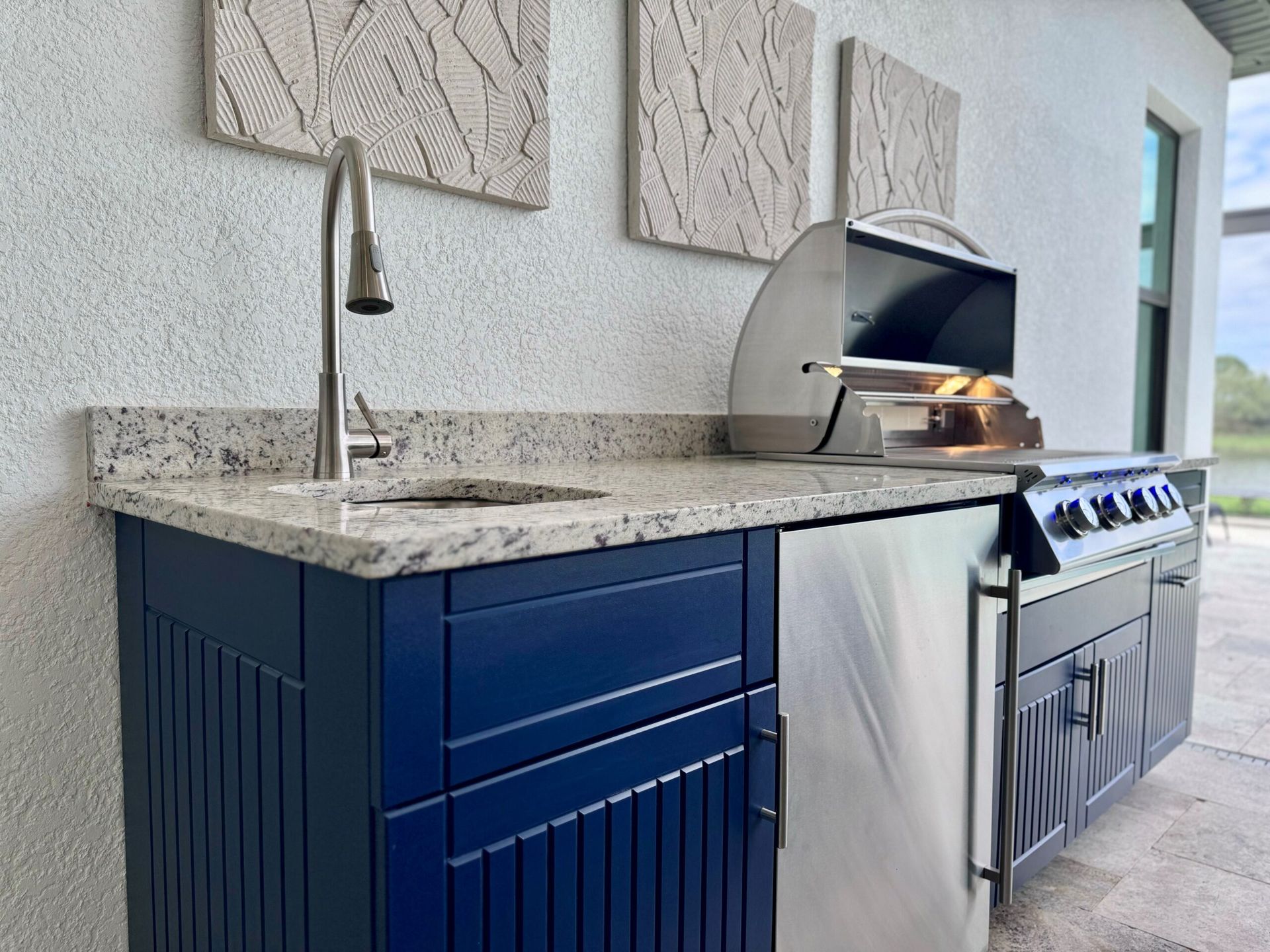Sometimes an outdoor kitchen isn’t just a cooking space, but a statement. This kitchen features a Sizzler Pro Grill framed with Oxford cabinets in Symphony Blue, with a backsplash of tasteful stone accents.