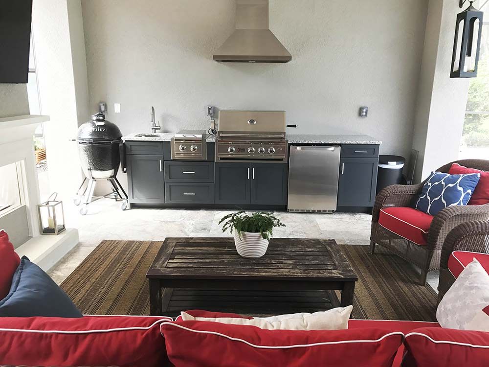 In this impressive Outdoor Living space, we designed an outdoor kitchen to flawlessly match the existing patio layout and decor. With a focus on entertaining, we created a space that was open and comfortable, with versatile cooking options.