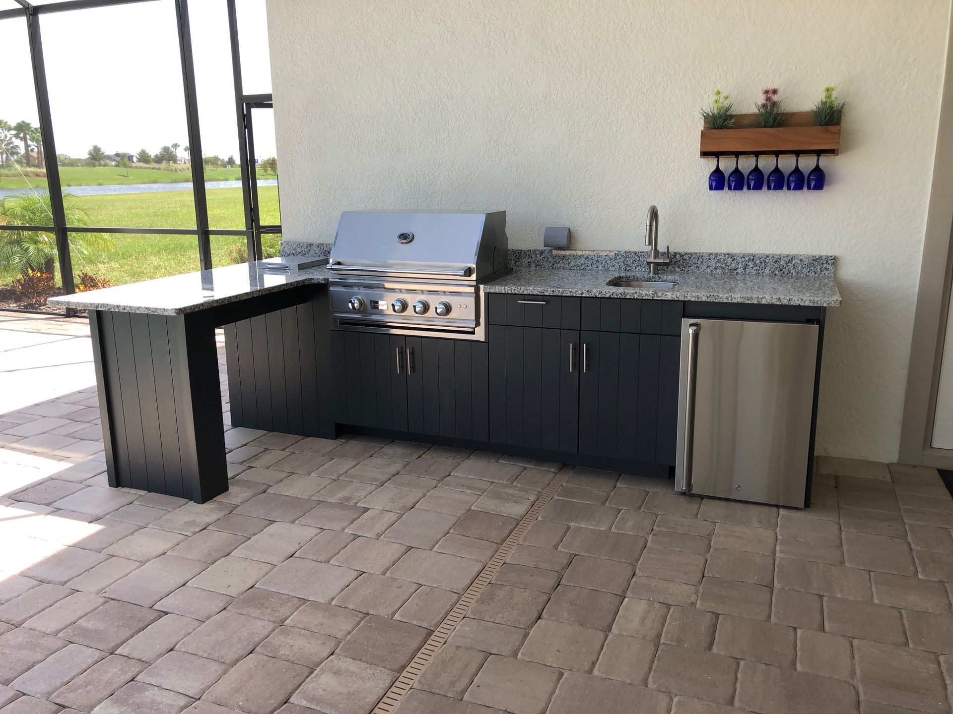 This Outdoor Kitchen installation has a clean and spacious design. With plenty of beautiful granite counter space, there is enough room for entertaining while you are cooking. The Summerset TRL grill features LED front panel lighting, stainless steel U-tube burners, and 18,000 BTUs (each burner).