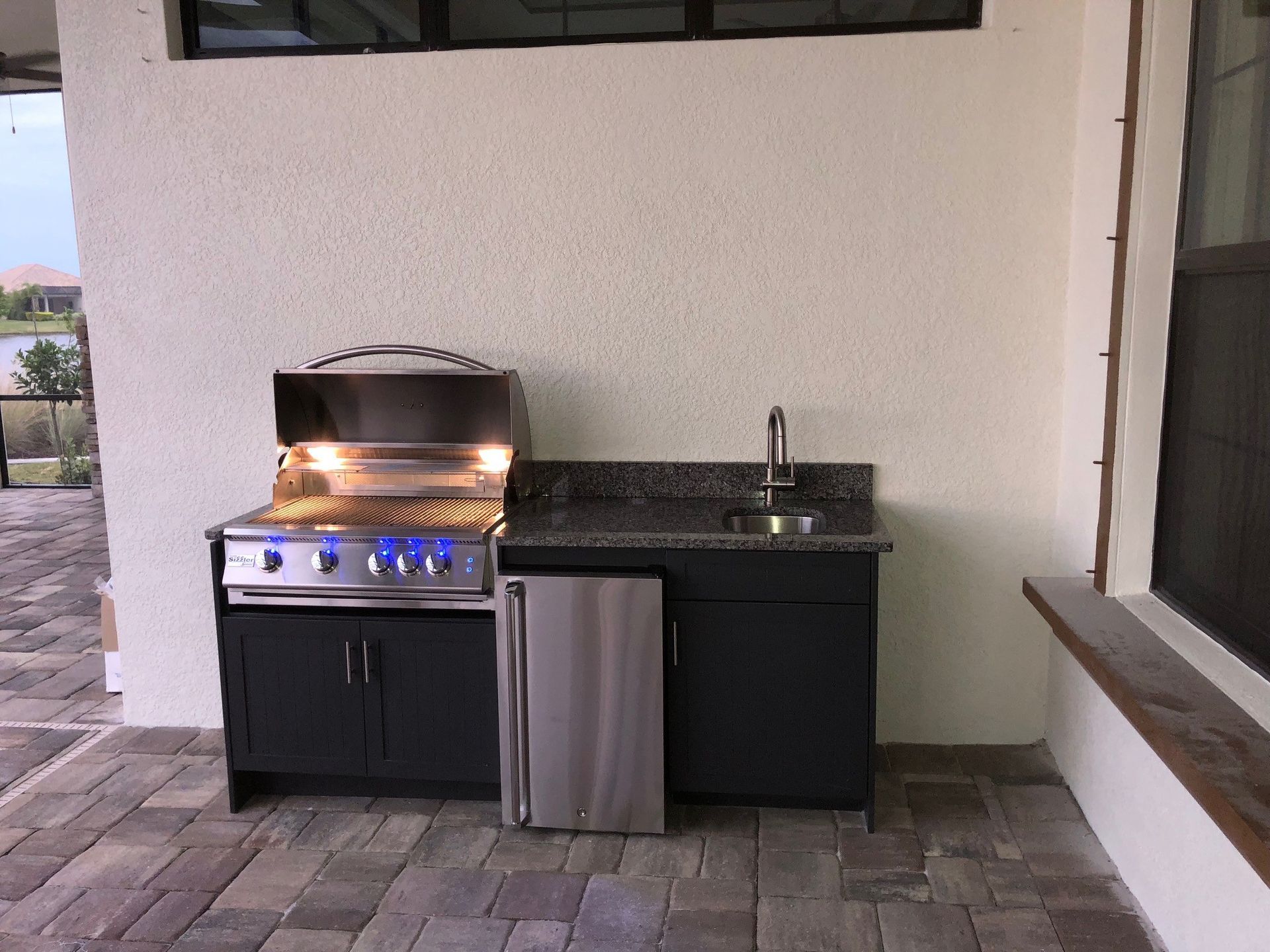This modern outdoor kitchen features all of the essentials needed to grill up the perfect meal. The Summerset Sizzler Pro 32′ Built-In grill has a sleek design with exterior LED lights and interior cooking lights. Our custom weatherproof cabinetry provides plenty of storage for spices and grilling utensils.