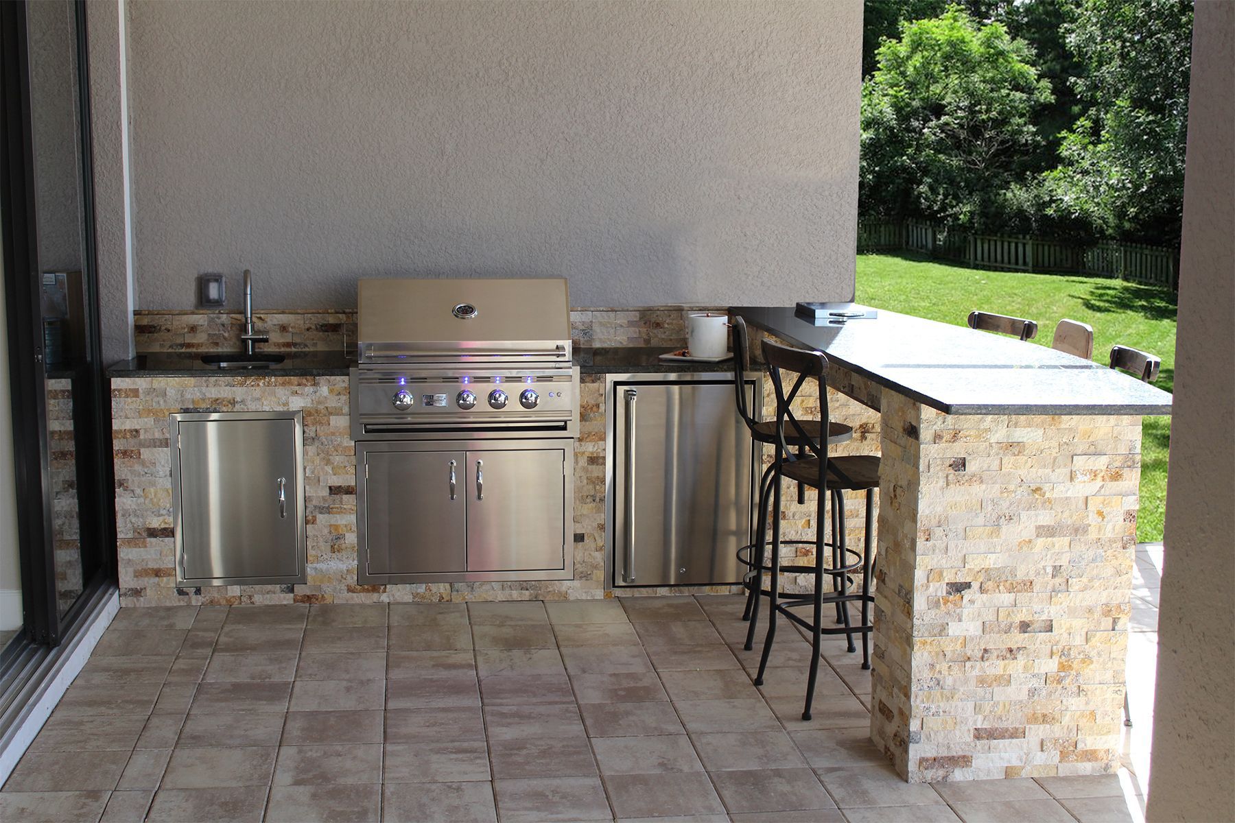 This amazing Outdoor Kitchen has so many great features. We built this kitchen island with stone and Uba Tuba granite. The components include a Summerset 32″ TRL grill, refrigerator, and sink. What make this kitchen unique is the built-in trash chute with drawer, so no more worrying about the garbage piling up around where your guests are trying to relax and eat.