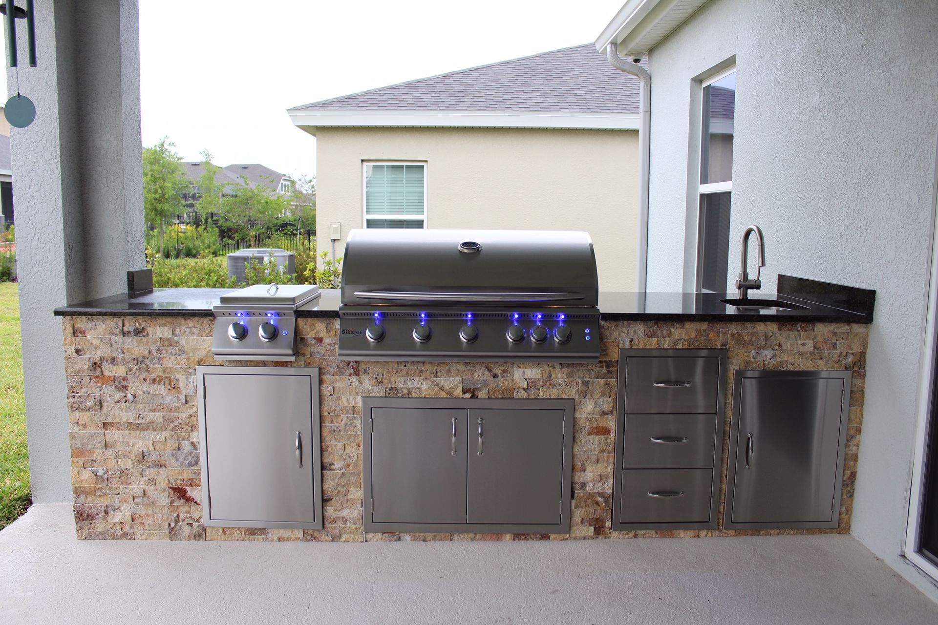 This beautiful kitchen island features a split face travertine with granite countertop. The Summerset 40″ Sizzler Pro grill boasts 14,000 BTU Cast Burners, Heat Zone Separators and Interior Cooking Lights to make for a premium grilling experience from top to bottom. This kitchen also offers plenty of storage for keeping cooking utensils, spices and accessories organized. The side burner offers numerous cooking benefits; especially for family members who maintain a vegetarian diet, but still enjoy cooking outdoors. This kitchen is a stunning combination of design and functionality.