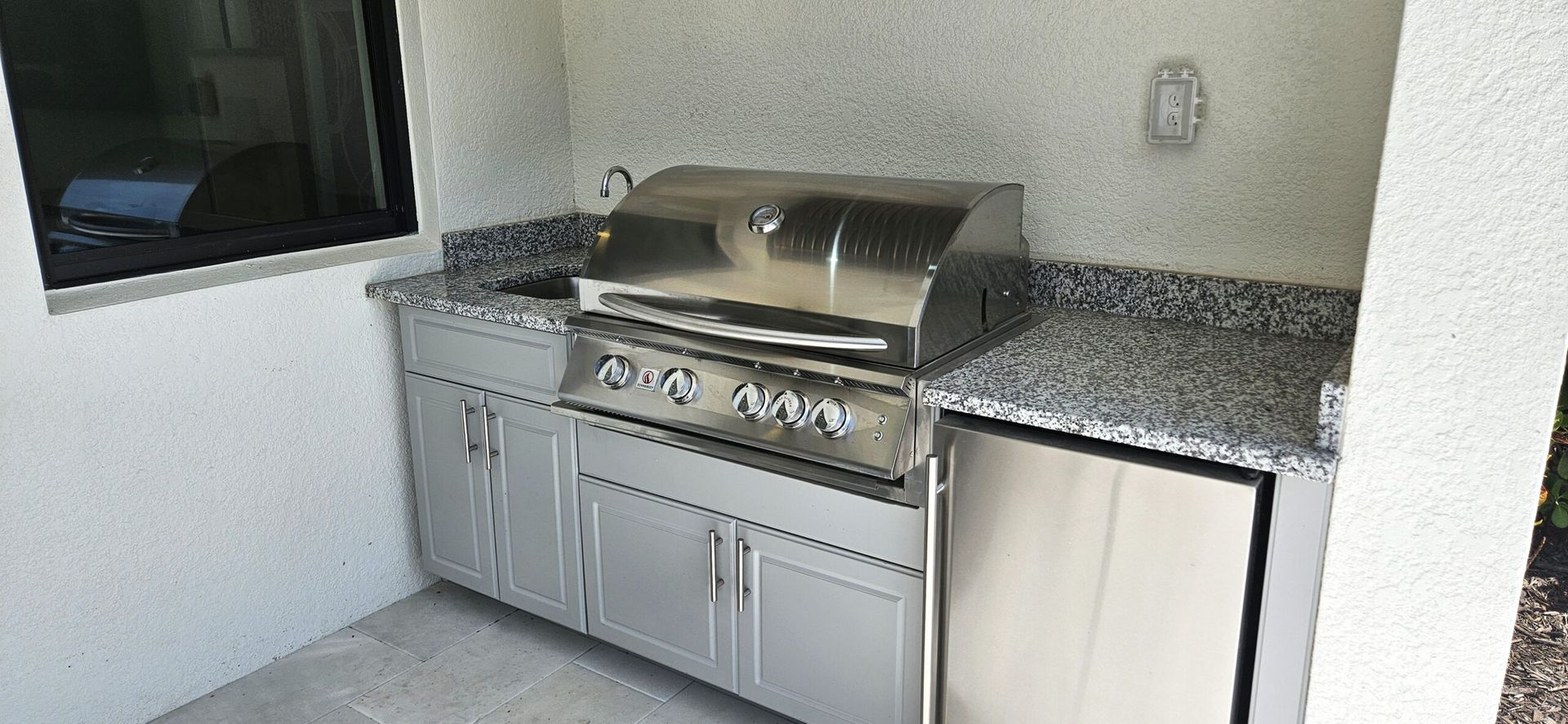 This outdoor kitchen provides a lot of utility in a compact space. Featuring a sizable Summerset Sizzler grill mounted among a beautiful Salt and Pepper countertop and Dolphin-colored cabinets, it proves that any space can accommodate the perfect toolkit for an outdoor dining experience.